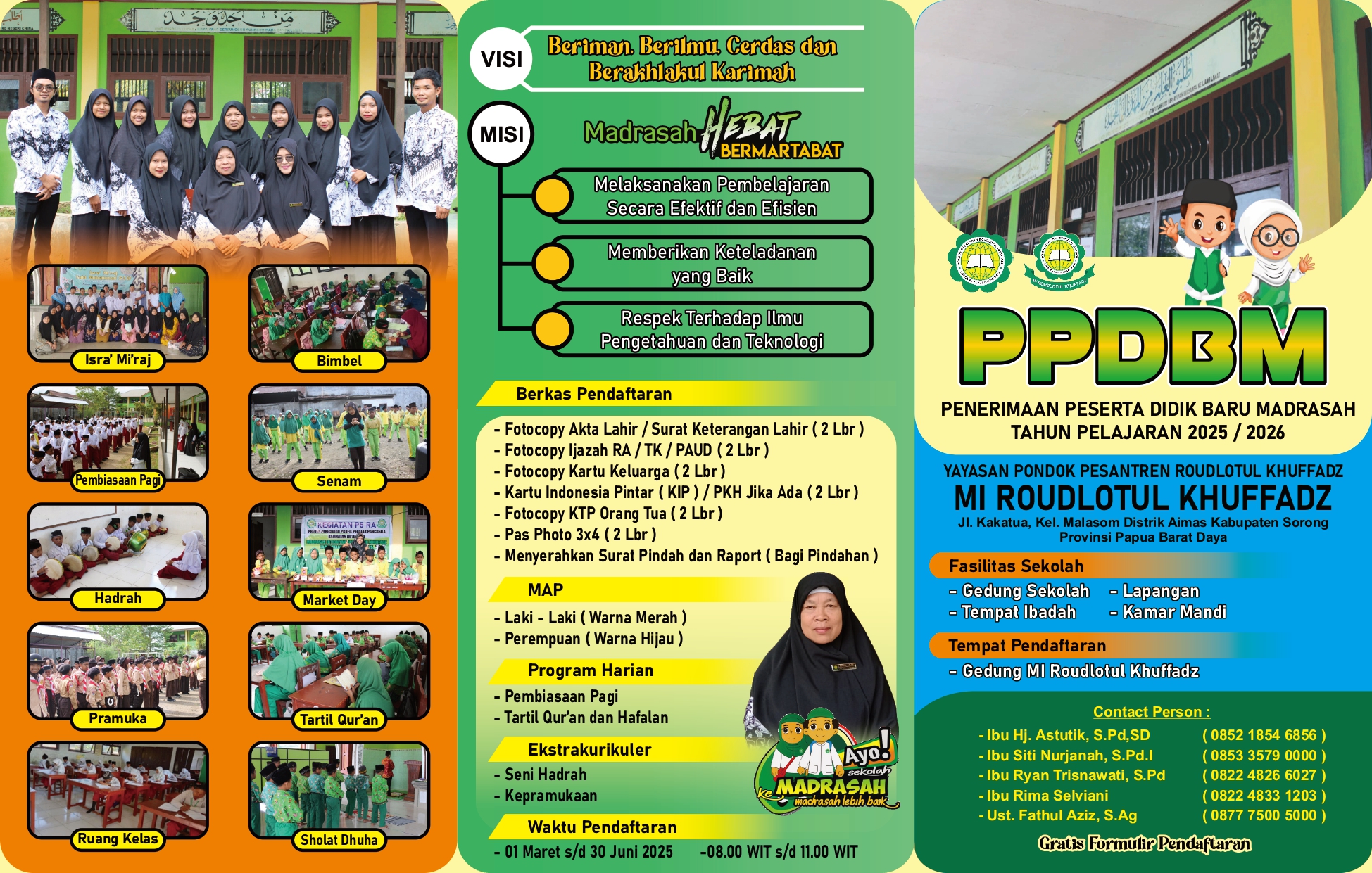 Seluruh proses seleksi dan pengumuman hasil juga dilakukan secara transparan melalui sistem online. Mari bergabung bersama MI Roudlotul Khuffadz, madrasah yang berkomitmen mencetak generasi beriman, berilmu, cerdas, dan berakhlakul karimah.